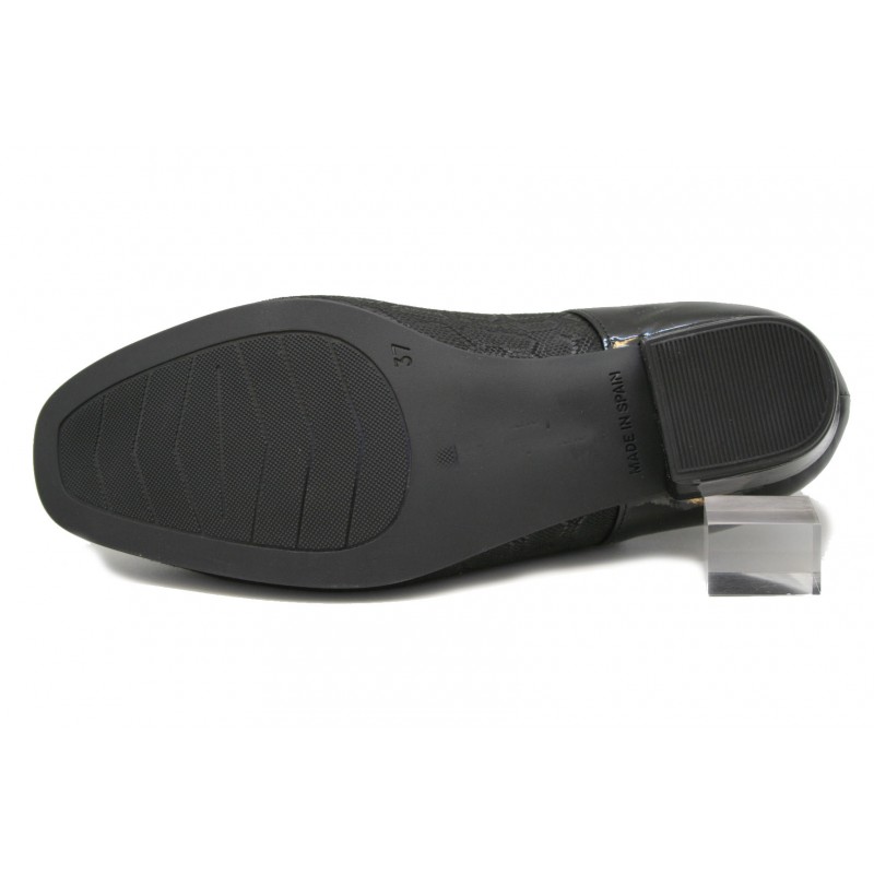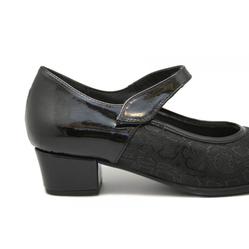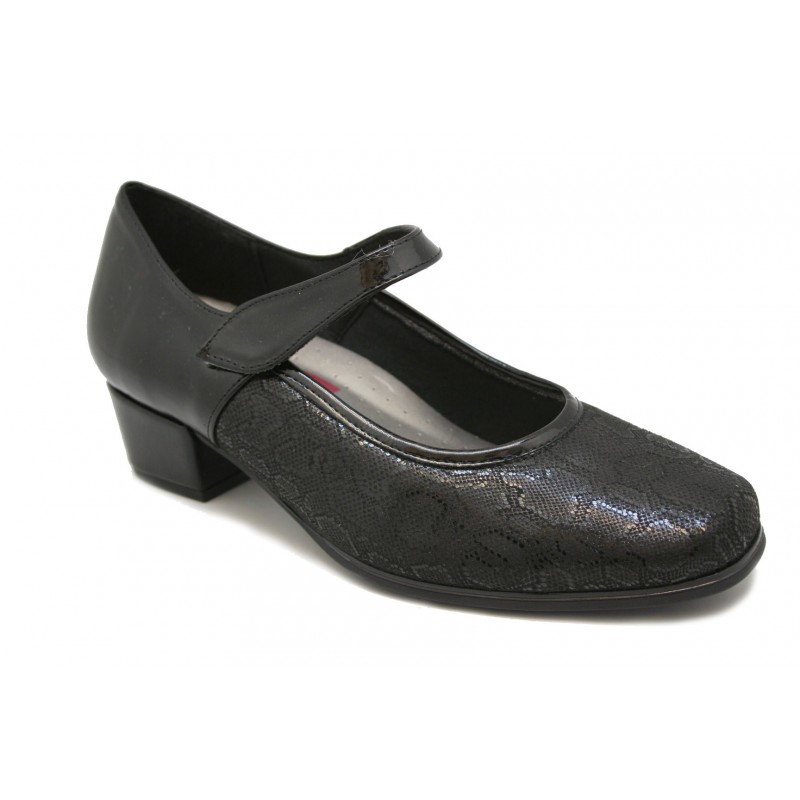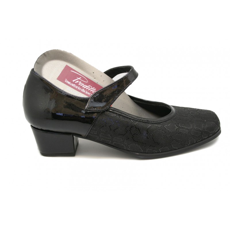Ancho y cómodo zapato tipo merceditas para mujer. Fabricado en lycra grabada negra con la trasera, tira mercedes y tacón en charol al tono. Plantilla ortopédica extraíble incluida en el precio. Zapato ideal para ir vestida y cómoda a la vez.