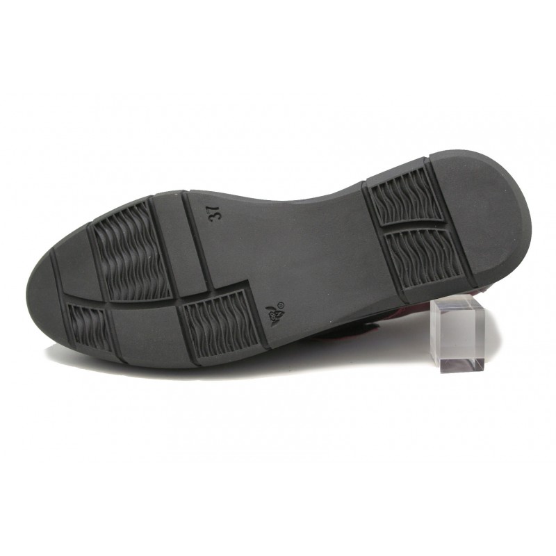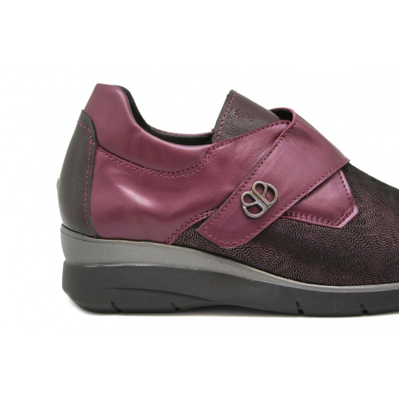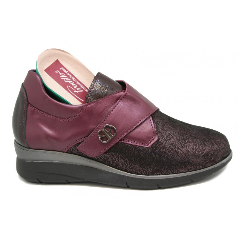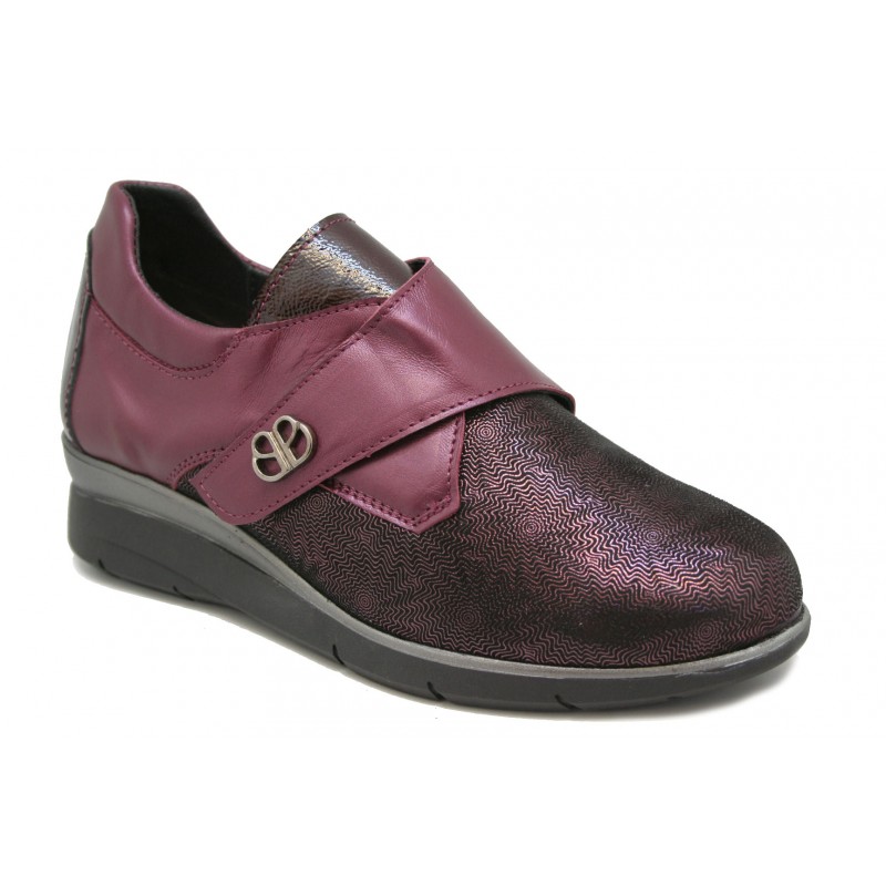 Zapato con velcro ajustable al empeine para mujer. Fabricado en una combinación de nappa, lycra y charol color burdeos. Todo el chanclo va en lycra, ideal para los pies con juanetes, anchos ó delicados. Plantilla extraíble e intercambiable por la del cliente. Forro de piel y lycra. Piso cuña negro con ribete en color plata.