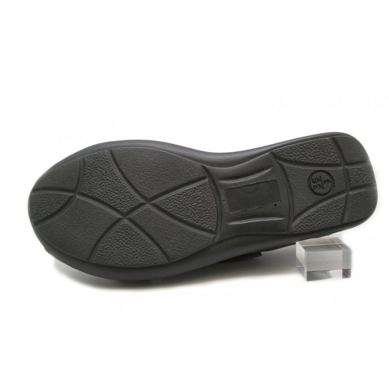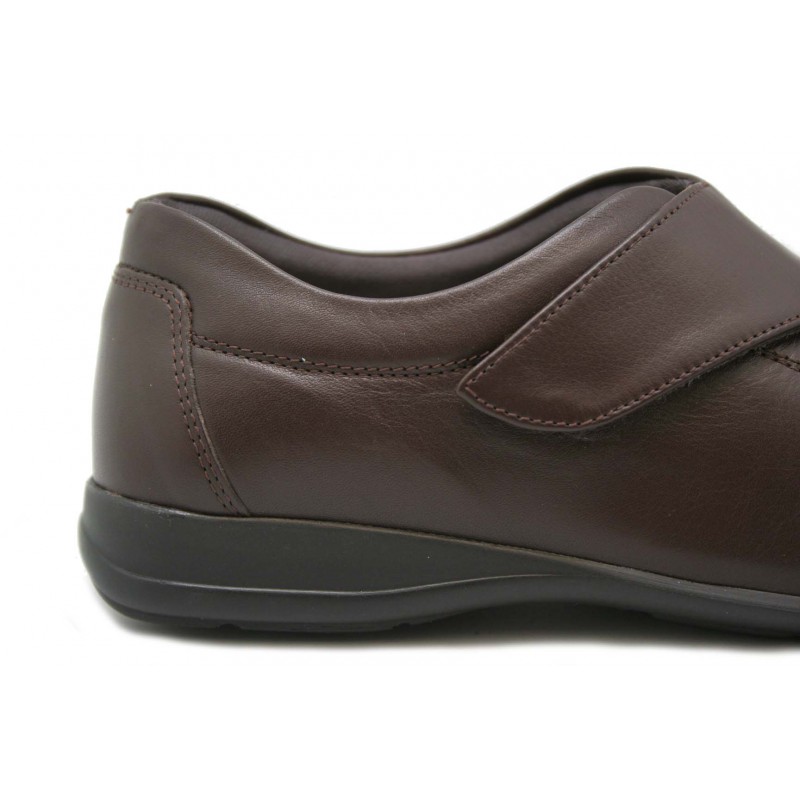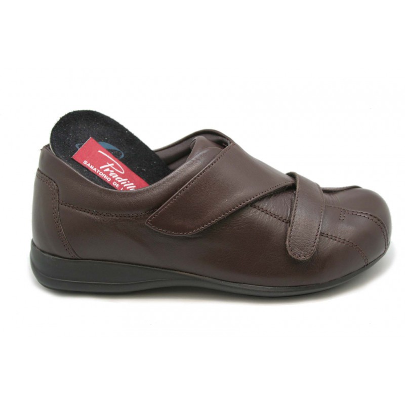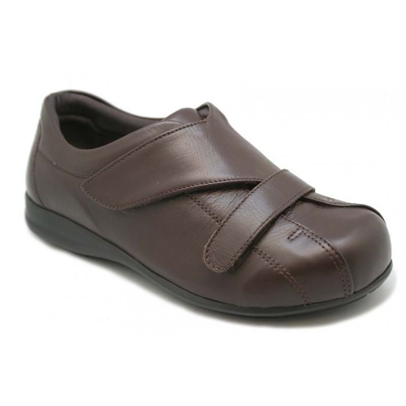 Zapato para pies diabéticos. Todo en nappa marrón con apertura total en el empeine y dos bandas de sujeción con velcro. Forro anti alérgico. Plantilla anatómica extraíble. Ideal para post-operatorio